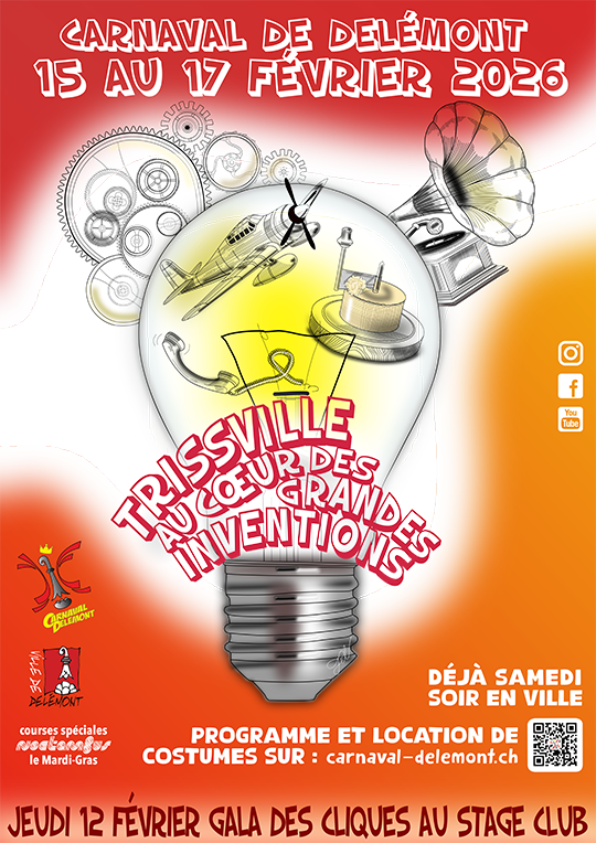 L'édition 2026 du Carnaval de Delémont se déroulera du samedi 15 février au lundi 17 février 2026 sur le thème "TRISSVILLE AU COEUR DES GRANDES INVENTIONS".